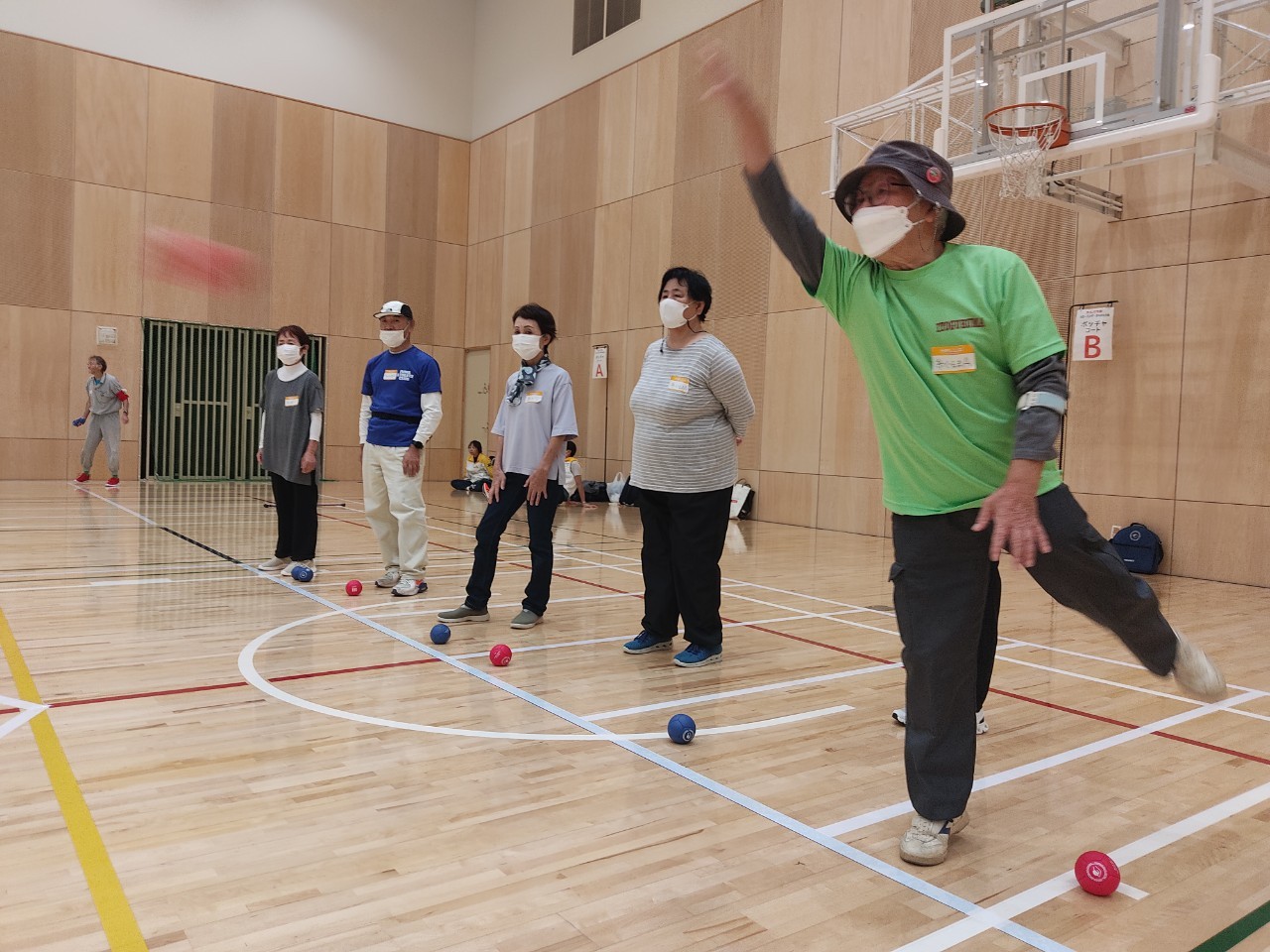 白い目標球に赤・青のボールをどれだけ近づけられるかを競うパラスポーツ。