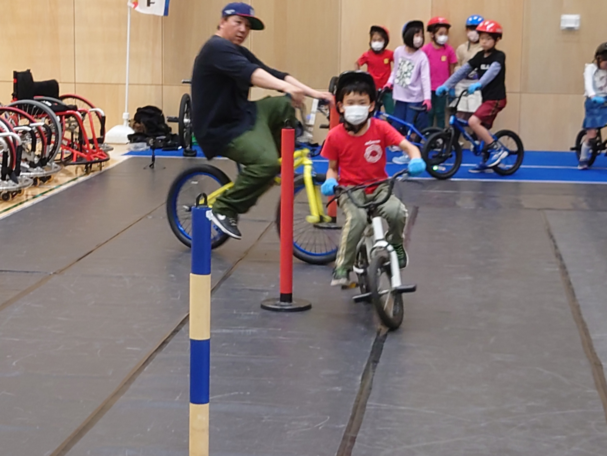 川崎市ゆかりの佐々木慶治選手・堀井明選手をゲストに迎え行った、BMXを使った自転車走行技術レベルアップ教室。