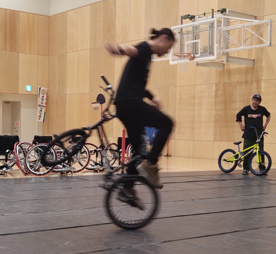 3回目は参加者が少なめだったので、「フロント上げ」や「メリーゴーランド」などのBMXトリックレッスンも行いました。- スポーツ車椅子で遊ぼう