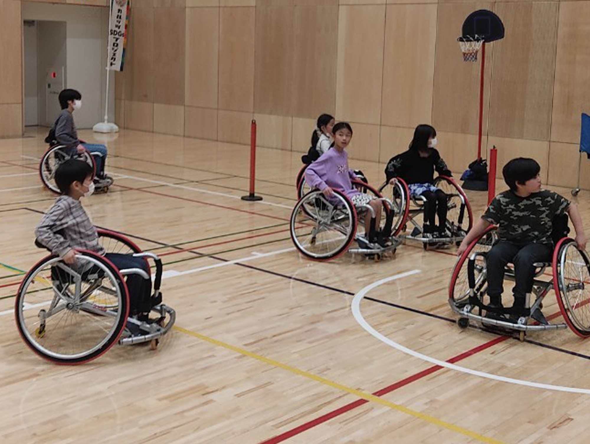 車椅子スラローム対決・車椅子だるまさんが転んだ・車椅子バスケットボール体験・車椅子ドリブル2プッシュチャレンジの