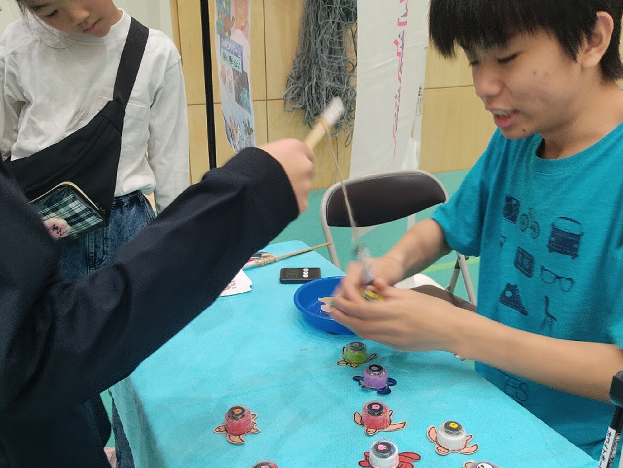 また、川崎区盛り上げ隊!のお子さんスタッフが考案した「ボトルキャップ亀釣りゲーム」にも54名の方々がチャレンジしてくださり、