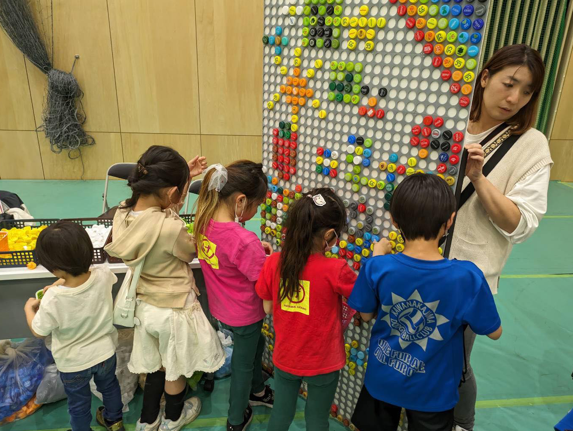300名近くの方にご参加いただき、見事なアートが完成しました。- ボトルキャップで遊ぼう!(協力:川崎区盛り上げ隊!)