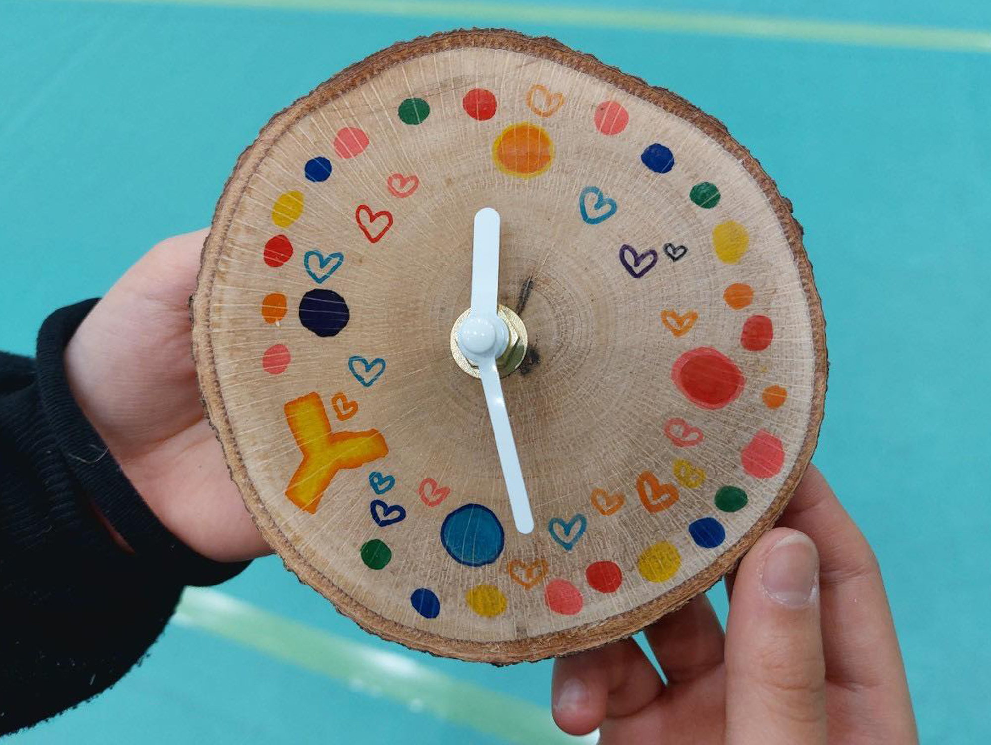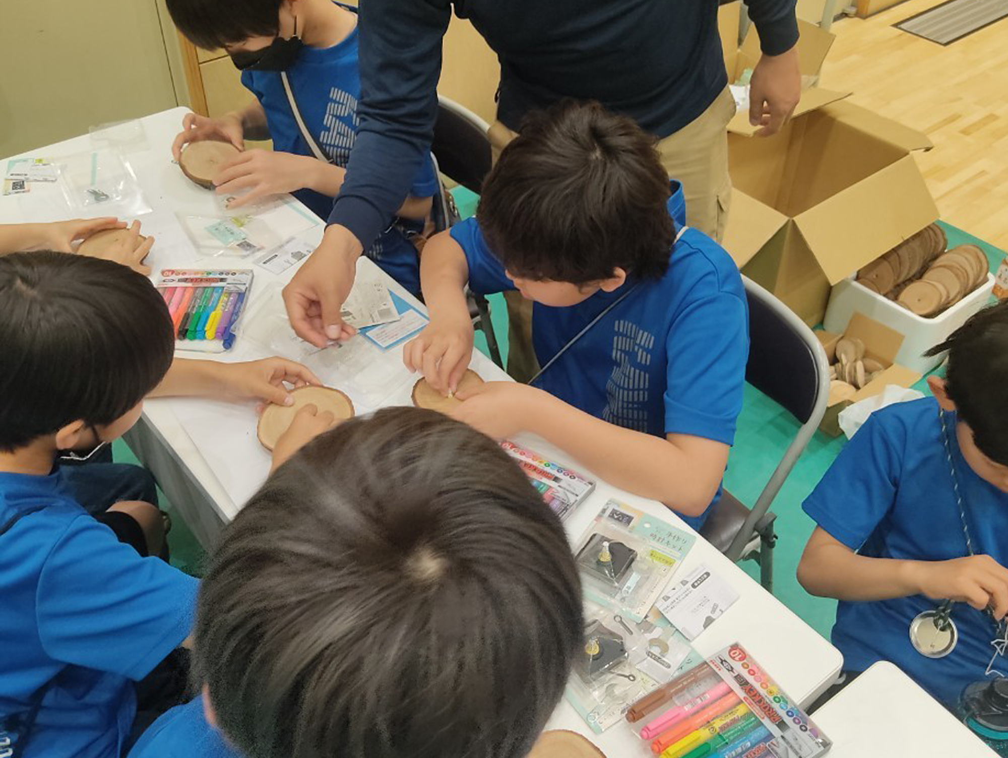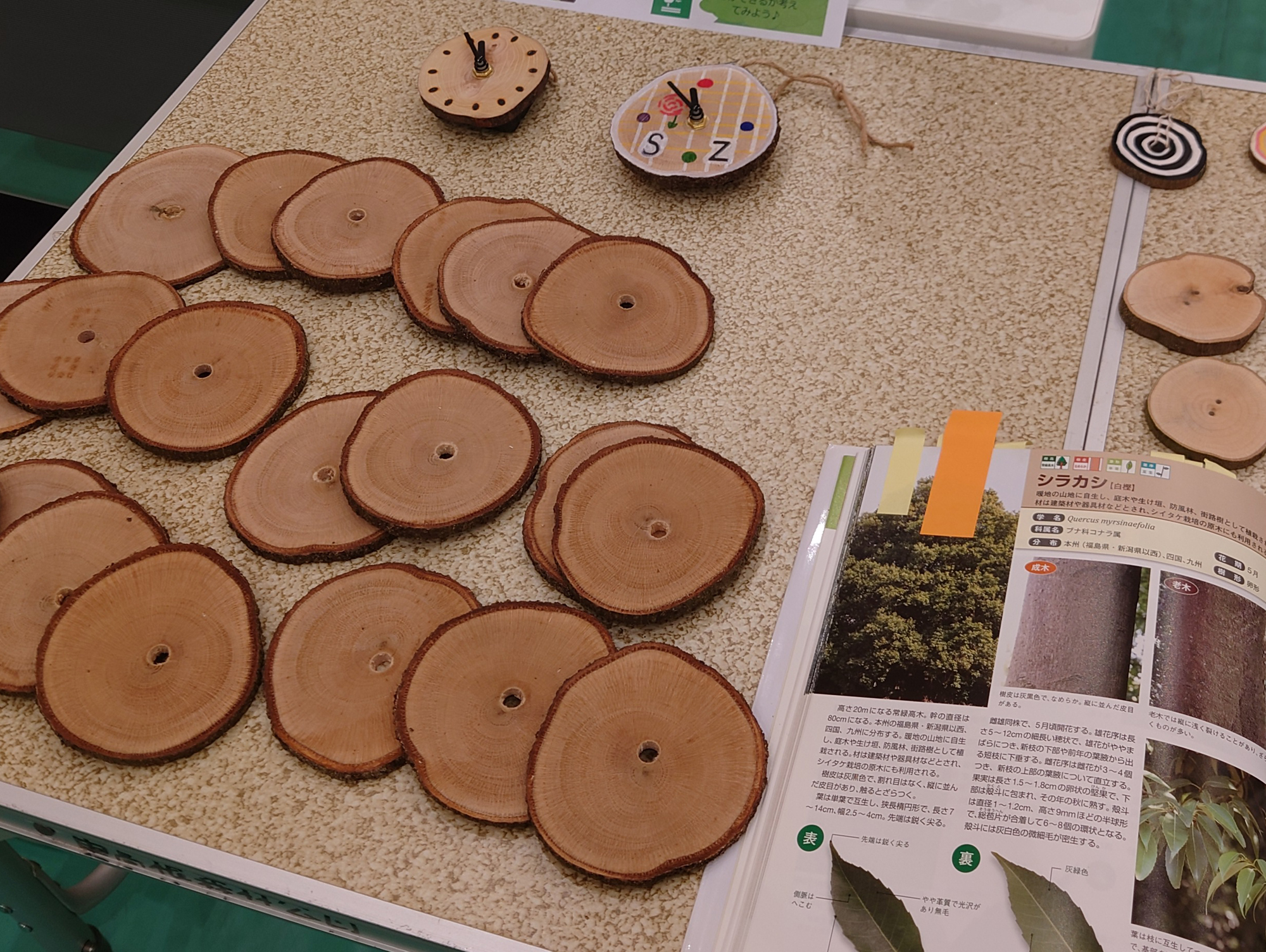参加者の皆さんにオリジナルの「時計」や「ぶんぶん独楽」を作っていただきました。
